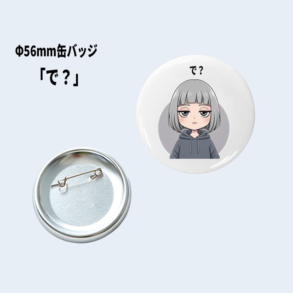 シンプルで強烈な一言「で?」をあしらったΦ56mm缶バッジ。