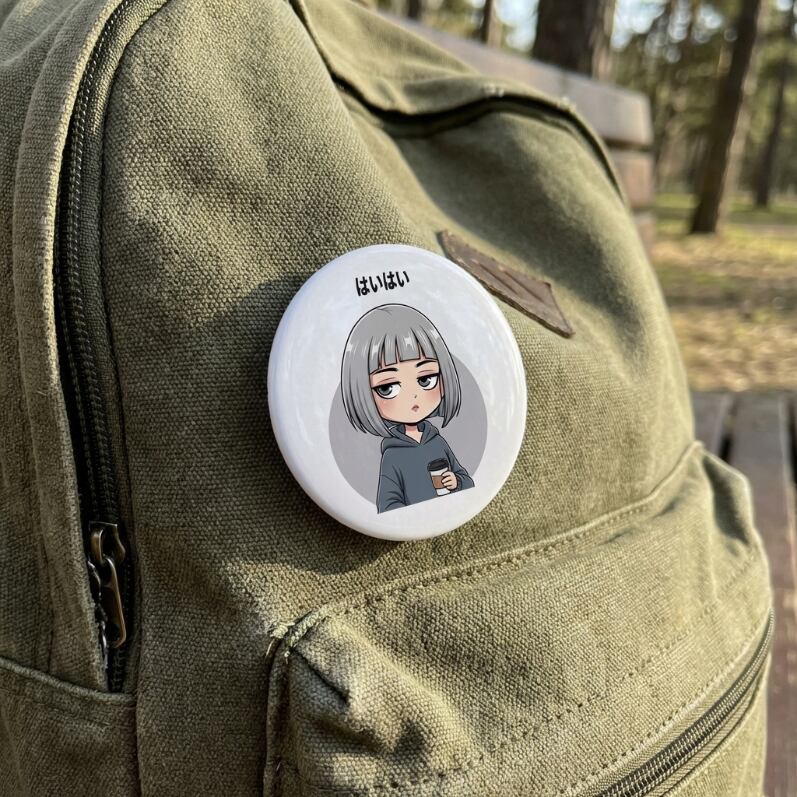 どこか呆れたような「はいはい」がクセになるΦ56mm缶バッジ。